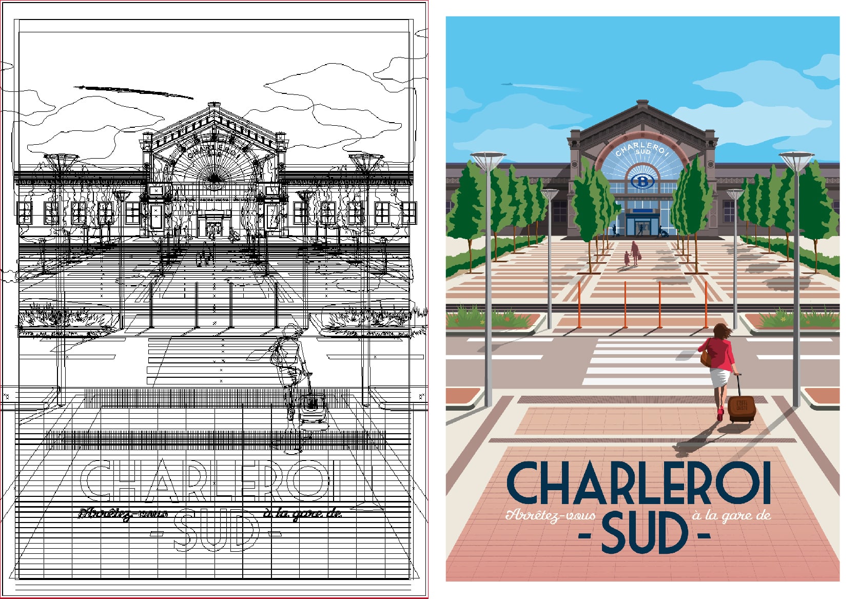 il faut ensuite passer aux tracés vectoriels des affiches. En d’autres termes, chaque élément de l’affiche est dessiné en tant que « forme » remplie d’un fond ou d’un contour. Cette seconde étape est un travail minutieux qui prend entre deux jours à deux semaines pour Antoine. Enfin, la touche finale est la typographie utilisée pour écrire le nom de la ville ou du lieu-dit.
